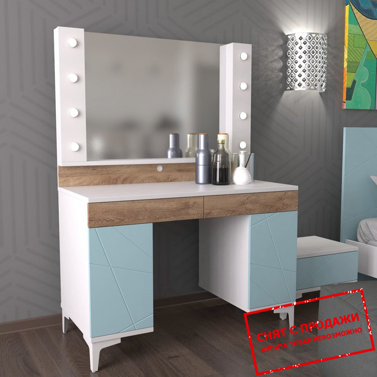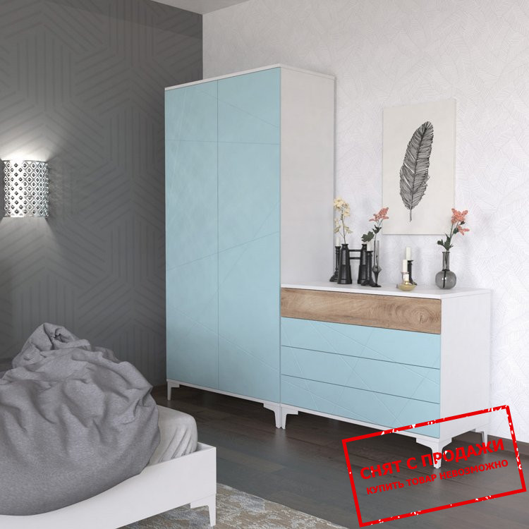 Компонентами системы являются зеркало, три комода, двуспальная кровать, полка, туалетный столик, тумба под телевизор, прикроватная тумба, двухдверный шкаф, навесной шкаф и трехдверный шкаф. Цветовая гамма в оттенке «пепельный софттач» и «голубая лагуна» выглядит идеально. Красивая мебельная система необходима для создания уютной атмосферы в доме. Обустройство гостиной требует внимательного подхода, ведь это святое место в доме. Простота и легкость помещения важны для создания неповторимой атмосферы. Преимущества этой мебели очевидны. Скандинавский стиль всегда актуален и приятен глазу. Эта мебель сочетает в себе эргономичность, прочность и привлекательный дизайн.