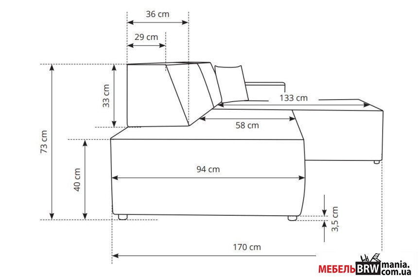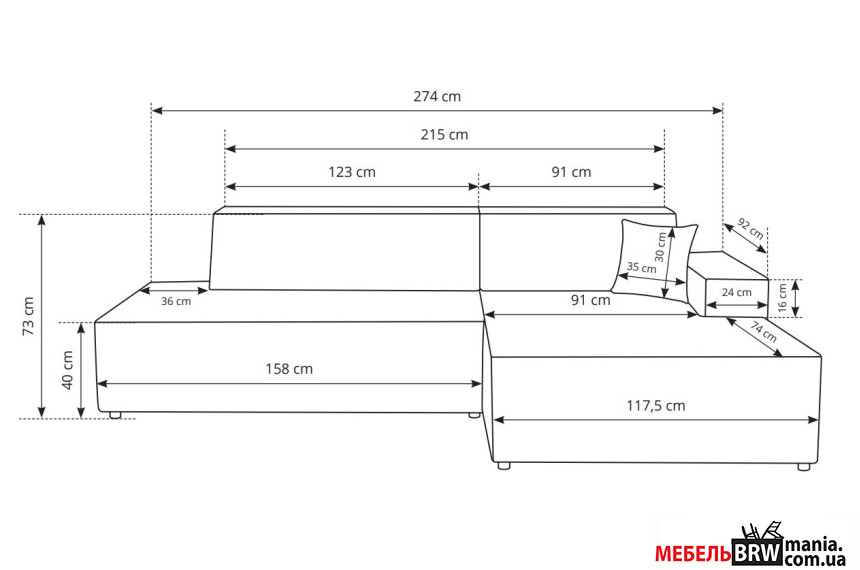 - Дополнительные характеристики 3 Подушки, 1 - 123х33 см, 1 - 91х33 см, 1 - 35х30 см