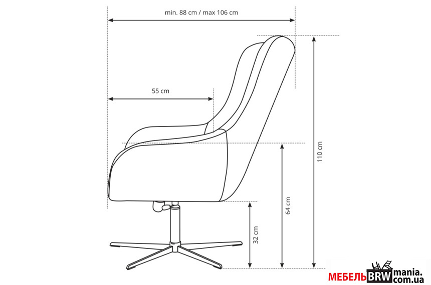 - Дополнительные характеристики Глубина: 88-106 см, Высота подлокотника: 64 см