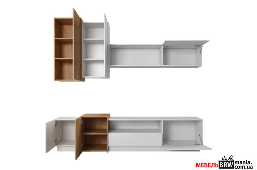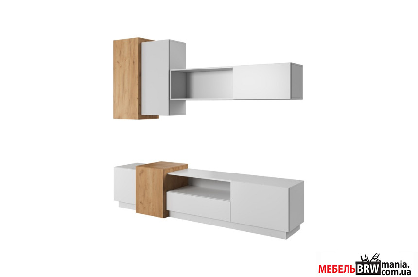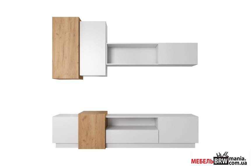 - Размер модулей Шафка навесная левая - Д-40 Г-37 В-93; Шафка навесная правая - Д-40 Г-32 В-83; Тумба под ТВ - Д-220 Г-45 В-54; Полка - Д-140 Г-32 В-33
