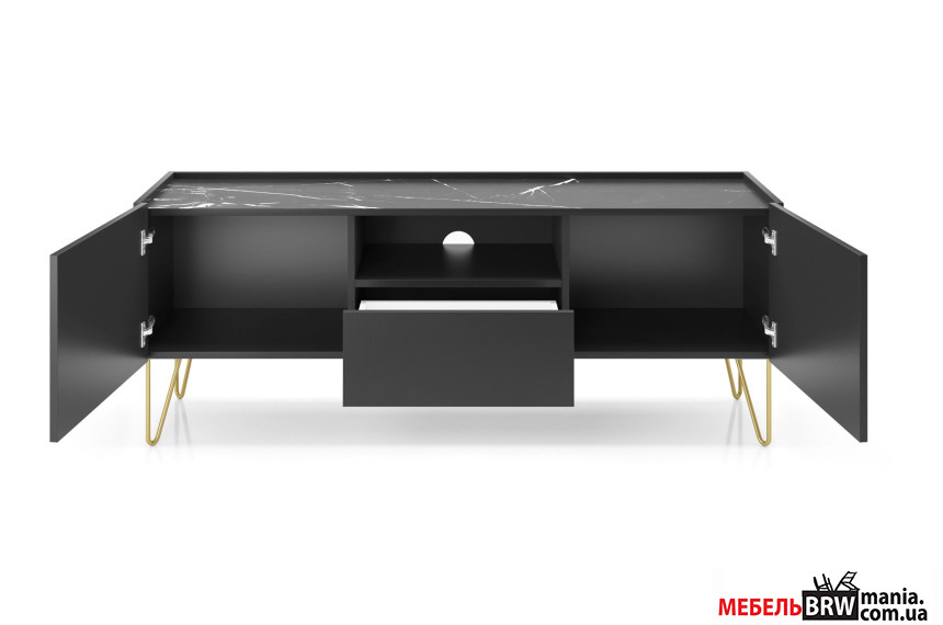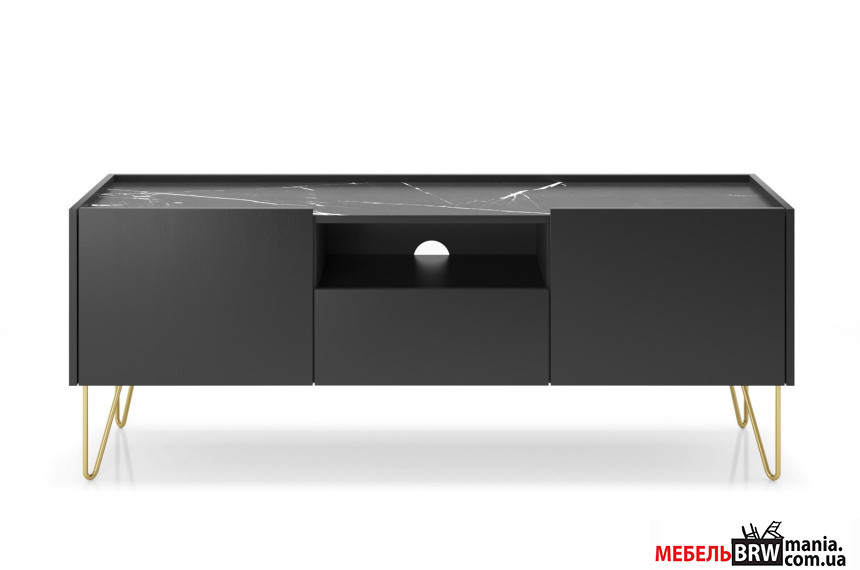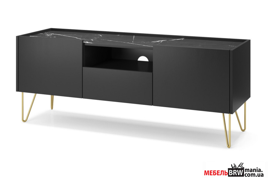 Тумба под ТВ Perfect Home Гармони / Harmony RTV144 1-дверная с 2 ящиками и золотыми ножками Черный/черный мрамор роял