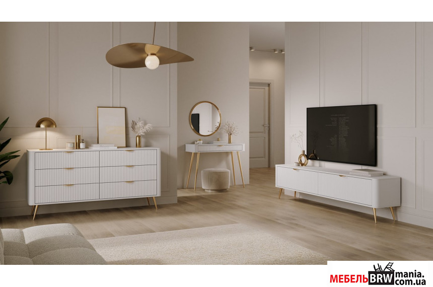 - Благодаря изысканному сочетанию белых рифленых фасадов, корпуса с металлическими ножками и фурнитурой теплого золотого оттенка, модель добавляет помещению невероятную атмосферу воздушности и сдержанную роскошь.