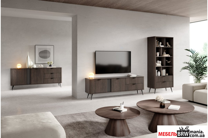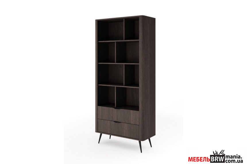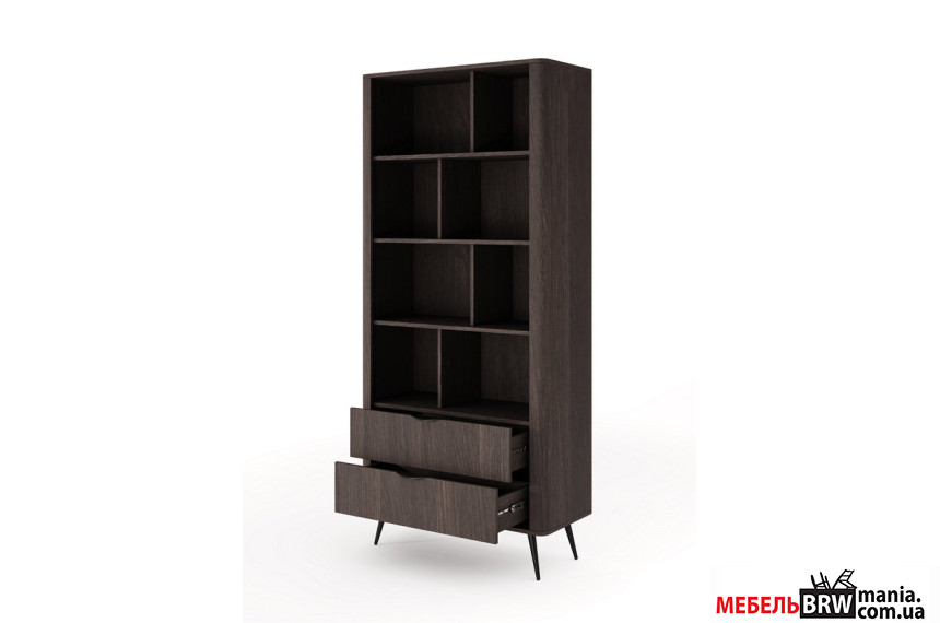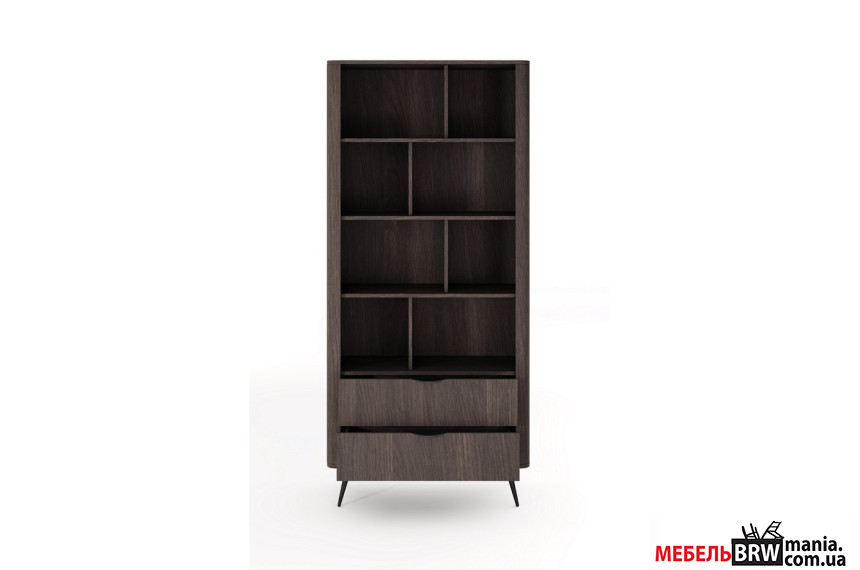 - Черные металлические ножки и ручки подчеркивают благородный цвет фасадов и придают стеллажу особую элегантность.
