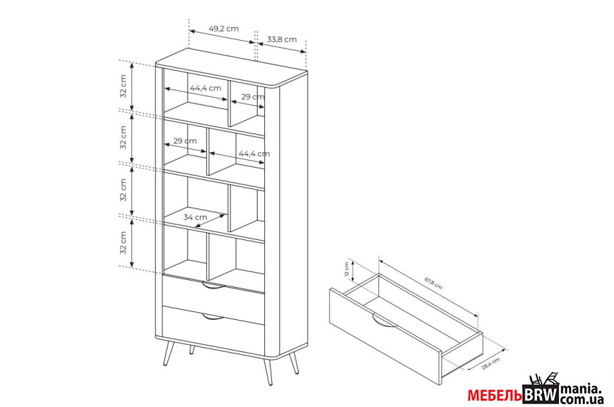 - Стеллаж оснащен полками с вертикальными перегородками и двумя вместительными ящиками, легко двигающимися по телескопическим направляющим.