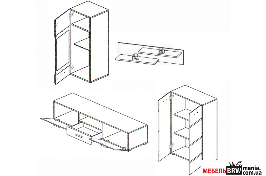 - Тумба под телевизор RTV2K1S – 1 шт. два открытых отделения, две откидные двери, один выдвижной ящик; максимальная нагрузка на столешницу 40 кг;