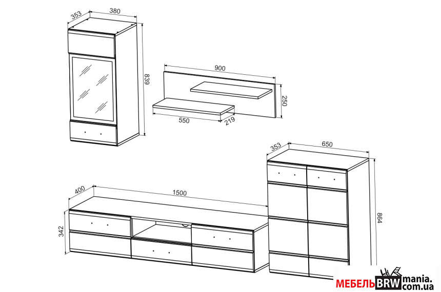 - Размер модулей Витрина навесная - Д-38 Г-35 В-84; Комод - Д-65 Г-35 В-87; Тумба под ТВ - Д-150 Г-40 В-34; Полка - Д-90 Г-22 В-25
