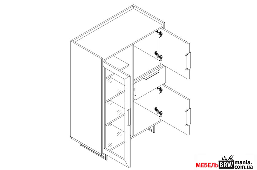 - Стенка Fresko БРВ состоит из четырех функциональных модулей: двух шкафов-витрин, открытой полки и тумбы под телевизор.