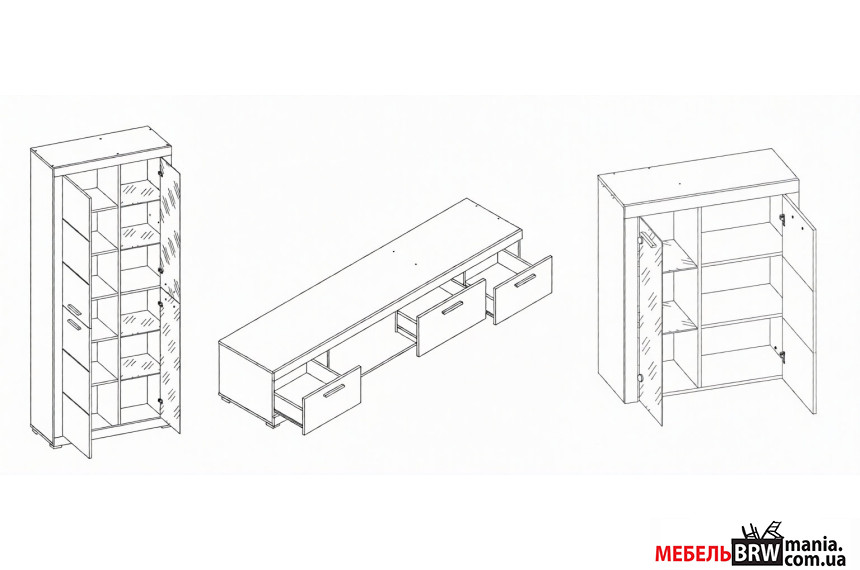 - Тумба под телевизор RTV2S – 1 шт. два выдвижных ящика, четыре открытые ниши;