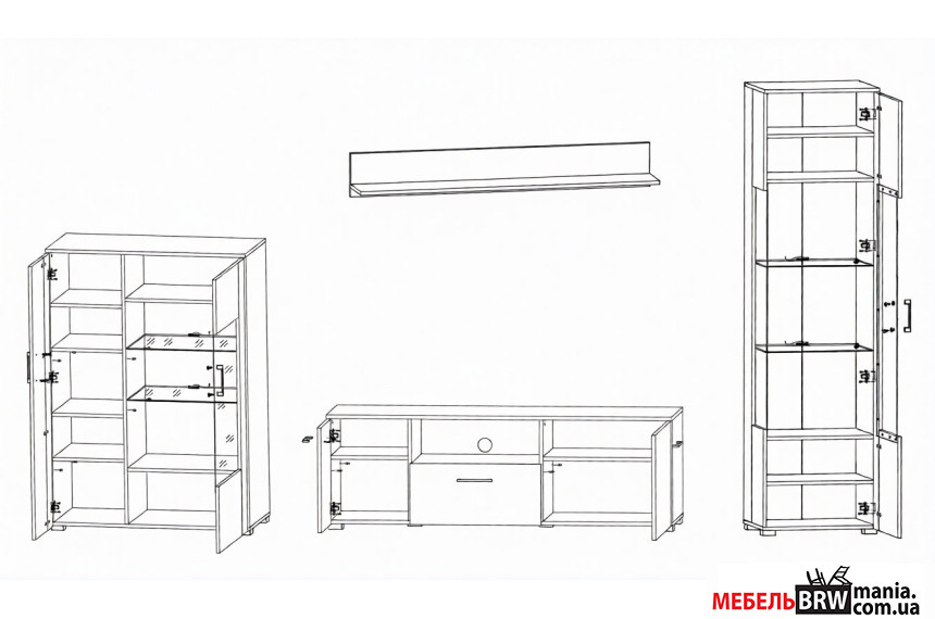 - Комплект Тумба под телевизор, две витрины и полка