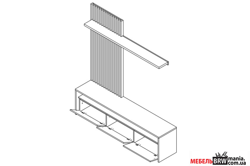 - Тумба под телевизор с тремя откидными дверцами и открытыми секциями.