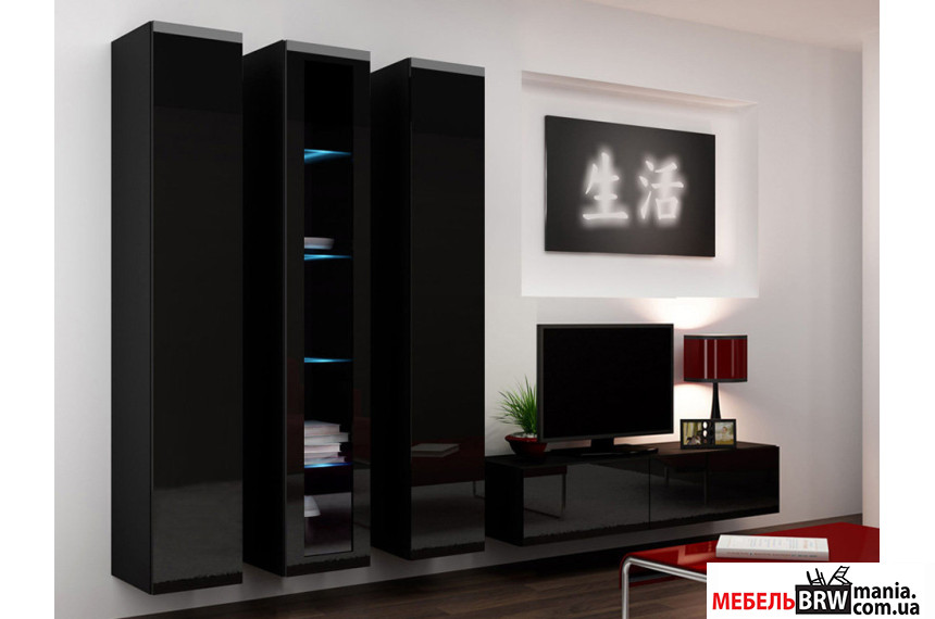 набор входит четыре элемента: тумба под телевизор и три навесные витрины.