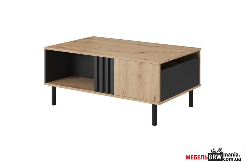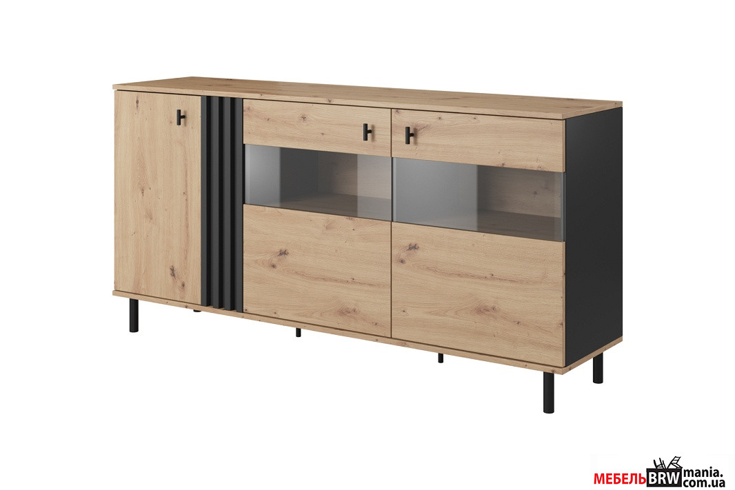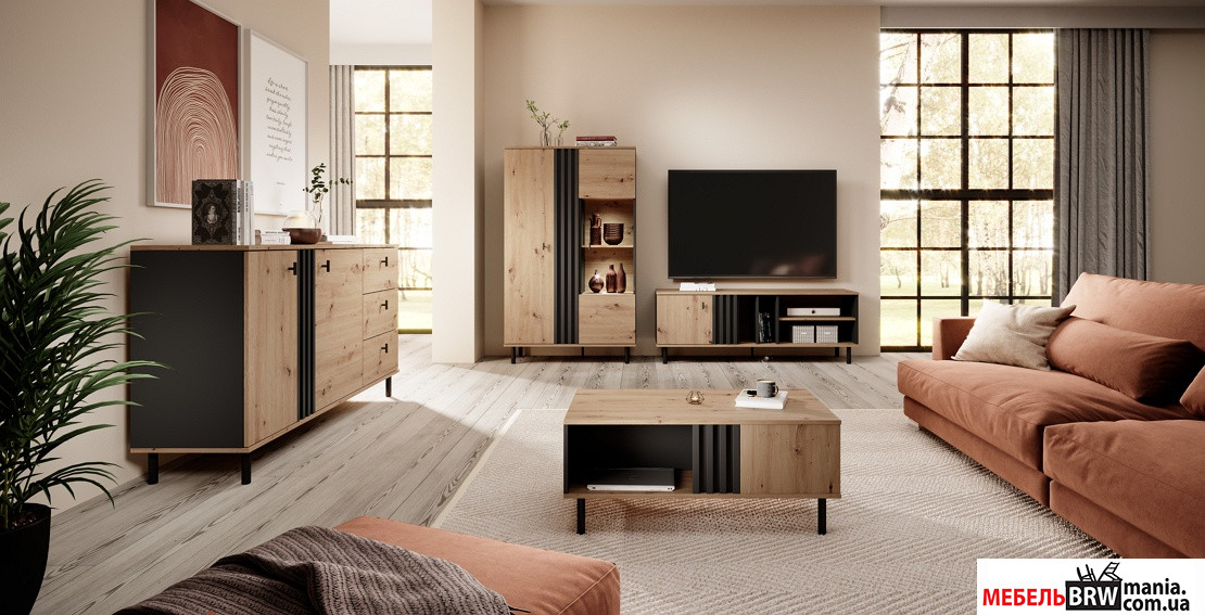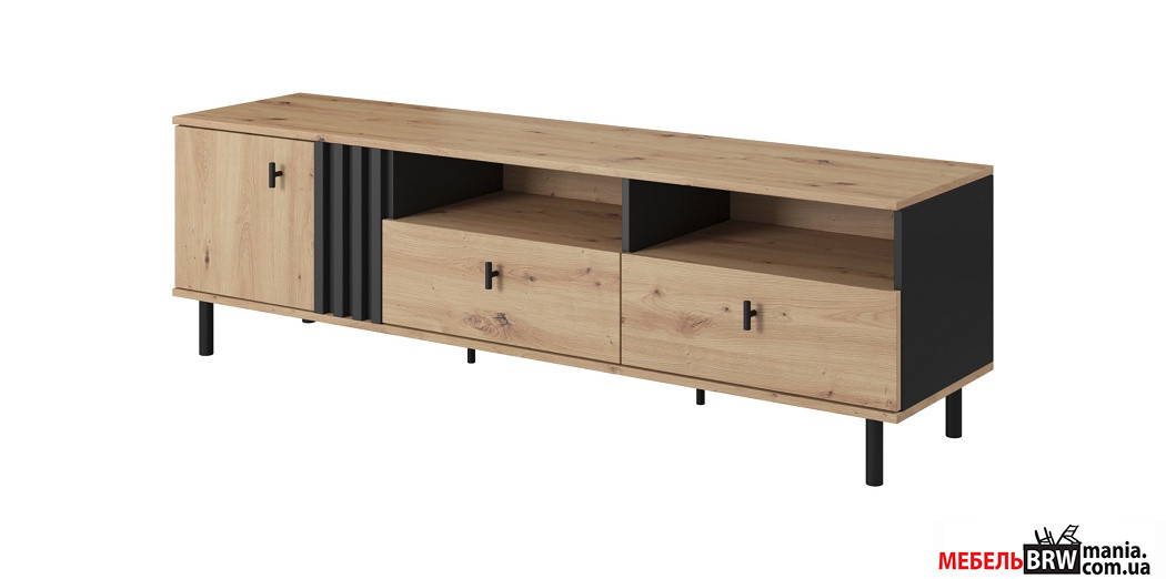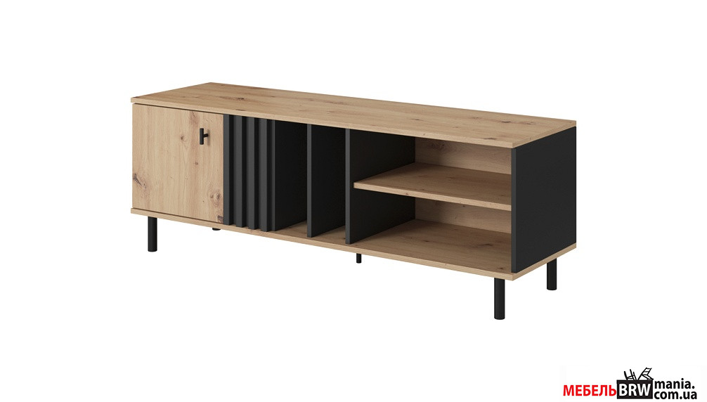 - Тумба под телевизор Madis 1D/138. Эта тумба не только стильно выглядит благодаря комбинации цветов "черный антрацит" и "дуб артизан", но и функциональна, с четырьмя полками для хранения.