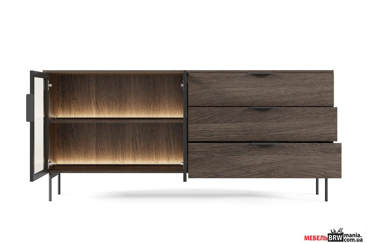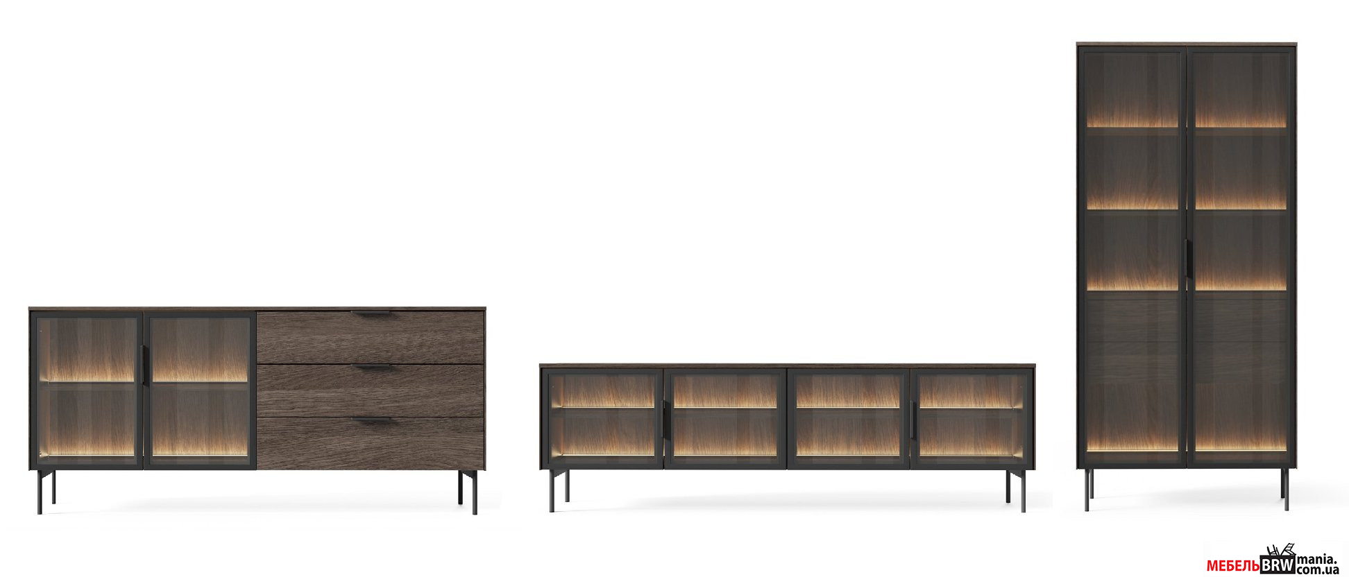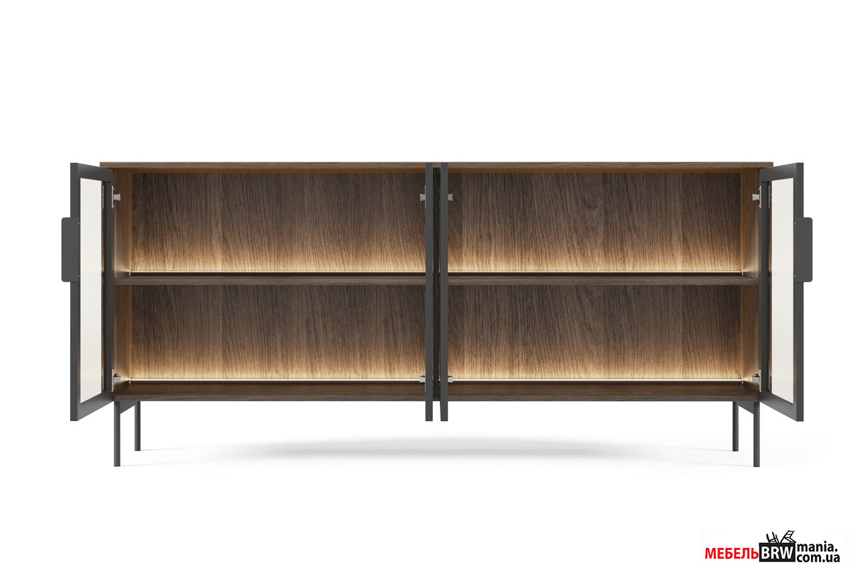 Сдержанный дизайн минималистического стиля с классическими нотками подчеркивается металлическими черными ножками и ручками, придающими коллекции современного характера. Еще одним преимуществом гостиной LUMI является встроенная подсветка теплого белого цвета – она создает уютную атмосферу в вечернее время и выгодно акцентирует отдельные элементы интерьера.