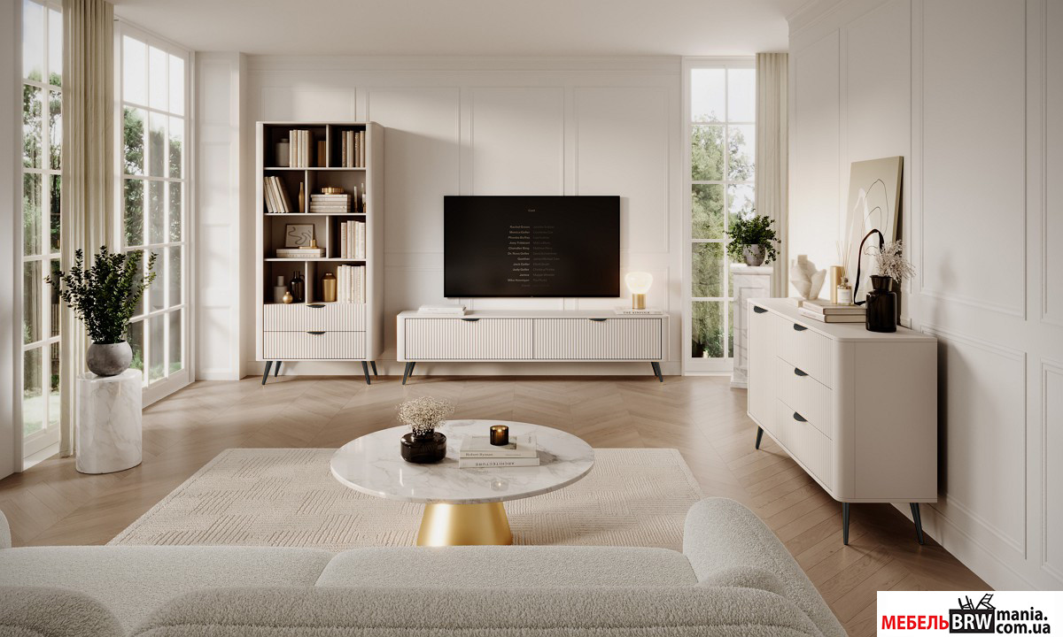 - Комод Lante 1D3S/138 (1-дверный с 3 ящиками беж). Этот комод идеально подходит для хранения безделушек и одежды, придавая гостиной выразительности благодаря своему бежевому цвету и золотистым ручкам.