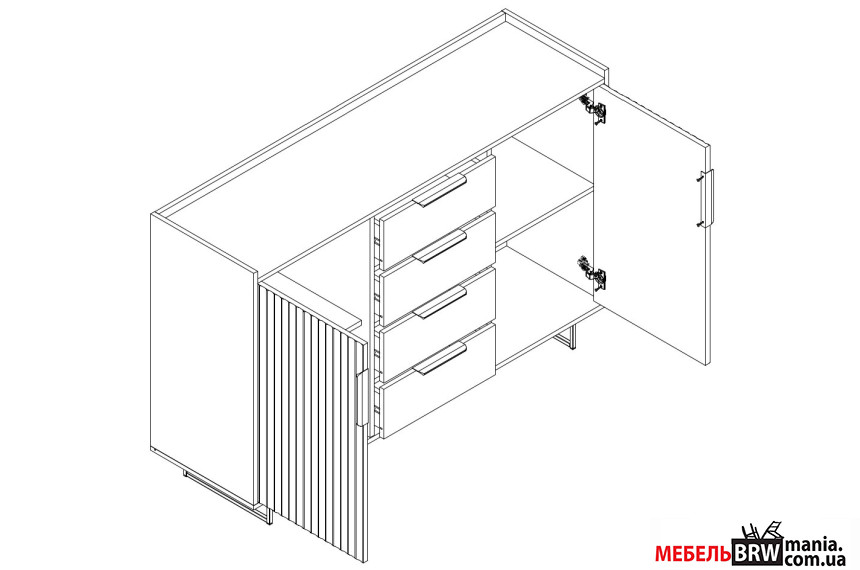 - Комод имеет два закрытых отделения и четыре ящика, что легко двигаются по металлическим направляющим.