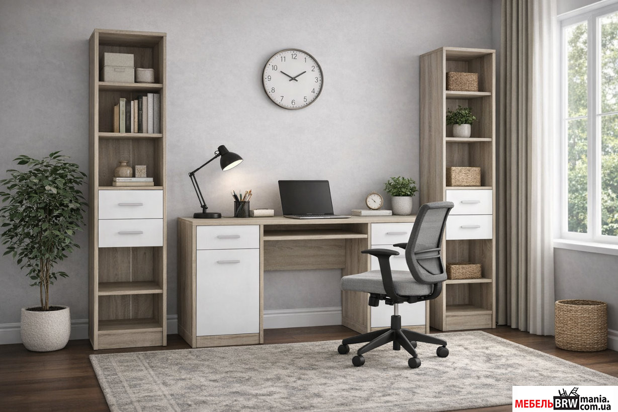 Решили обставить офис. Из-за ограниченого бьюджета выбирали недорогую мебель. Из всего ассортимента выбрали Непо в цвете дуб сонома. Взяли 4 письменных стола и шкаф. Сами меблы просты в сборке и за такую цену они себя оправдывают