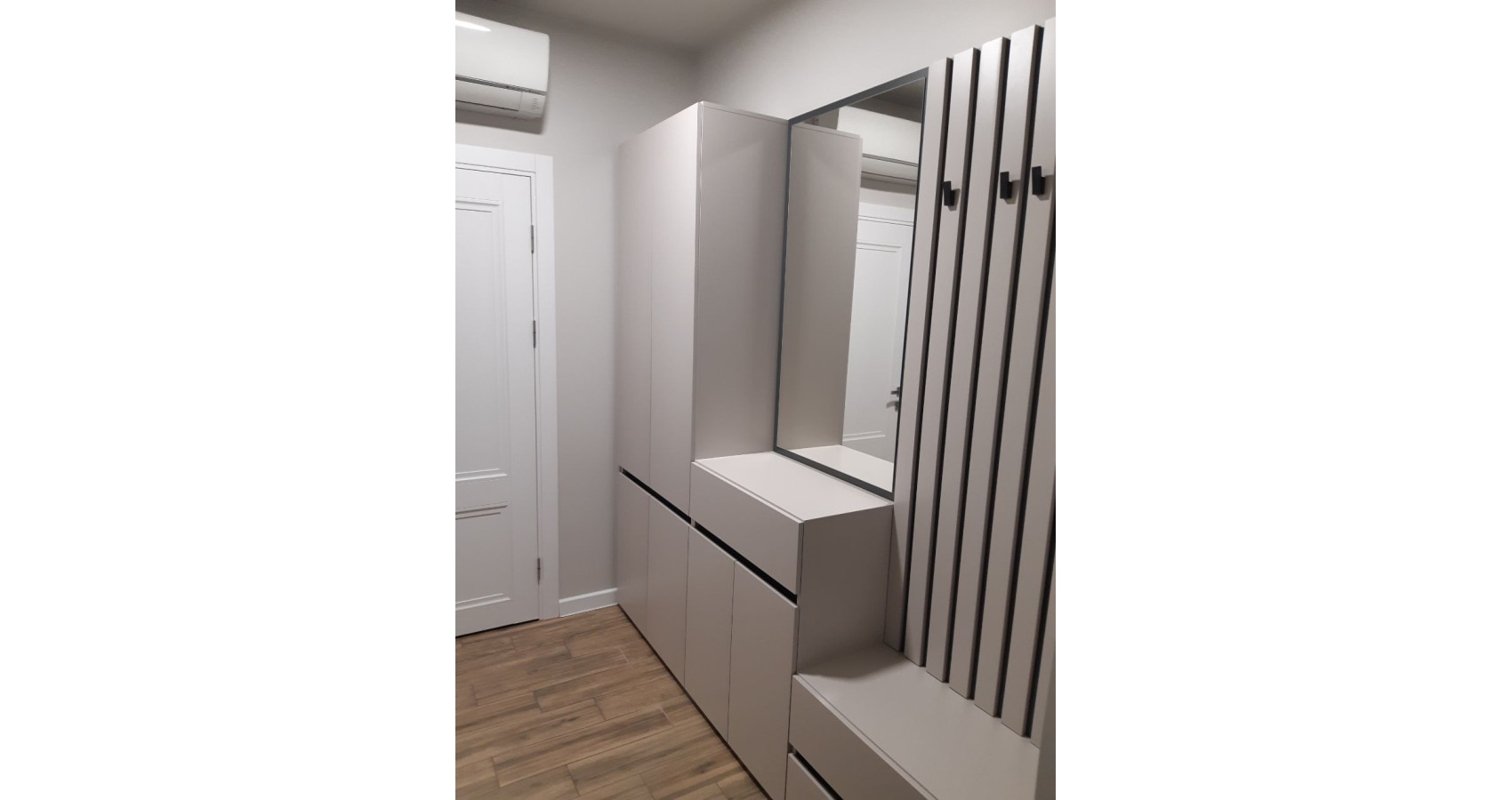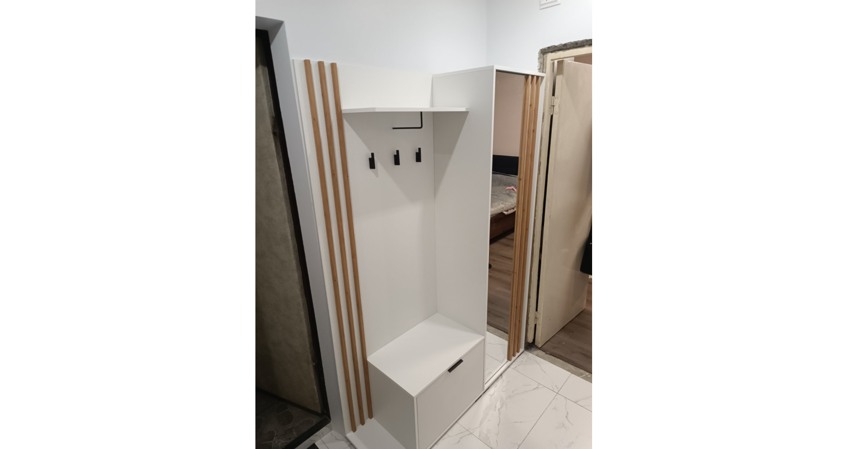 Класний передпокій Нелі! Дуже стильний, білий колір з дерев'яними вставками виглядає дуже гарно. Дзеркало велике, зручно дивитись перед виходом. Гачки для одягу міцні, вішати можна багато речей.