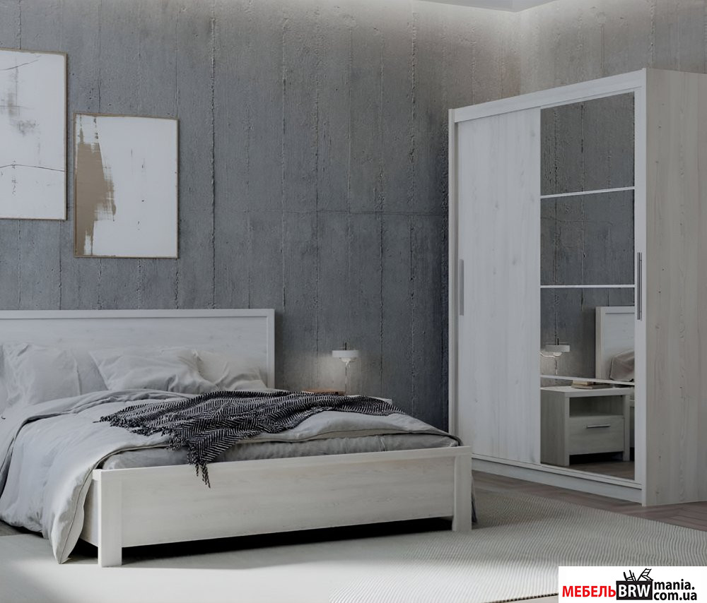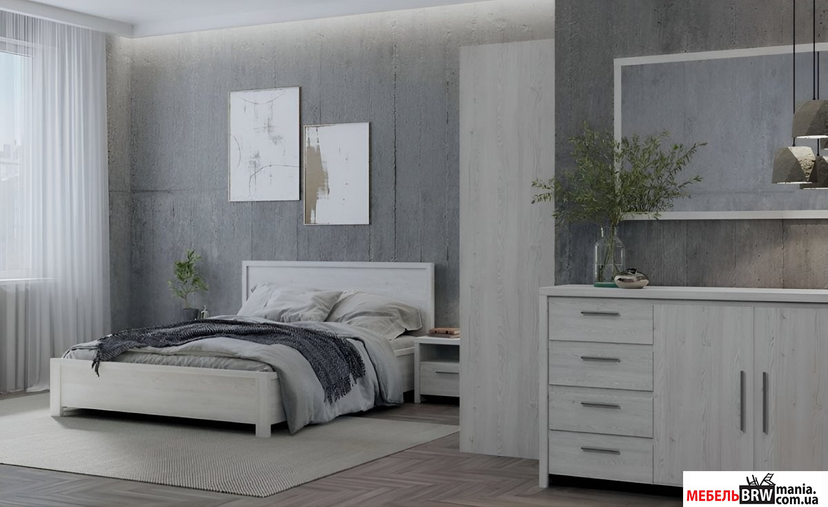 Спальня производится на фабрике БРВ-Украина с использованием корпуса и фасада из ДСП, а также металлических ручек. Кровать может быть отдельно укомплектована основанием. Также используются роликовые направляющие, придающие удобство в использовании. Купить мебель для спальни Blansh BRW можно как комплектом, так и поэлементно.
