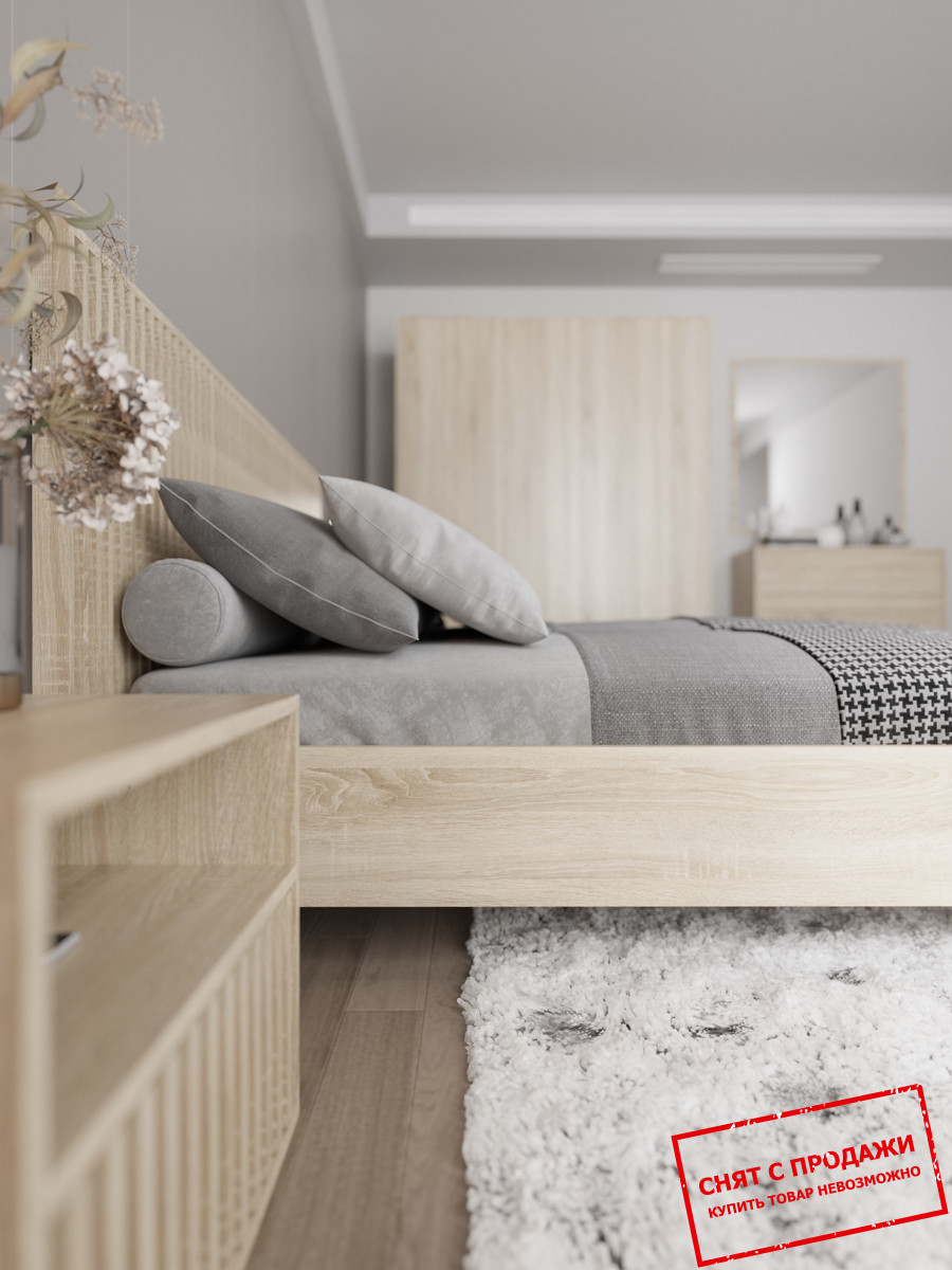 Комплект мебели для спальни способствует формированию гармоничного и согласованного внешнего облика интерьера. Объединение различных мебельных элементов, цветовых решений, текстур и стилей позволяет сотворить единую и привлекательную атмосферу, которая отражает индивидуальность и личные предпочтения. К набору принадлежат такие элементы: зеркало, комод, двуспальная кровать, прикроватная тумба, платяной шкаф.