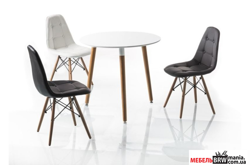 нестандартную форму столешницы и три прямых ножки. Круглая столешница