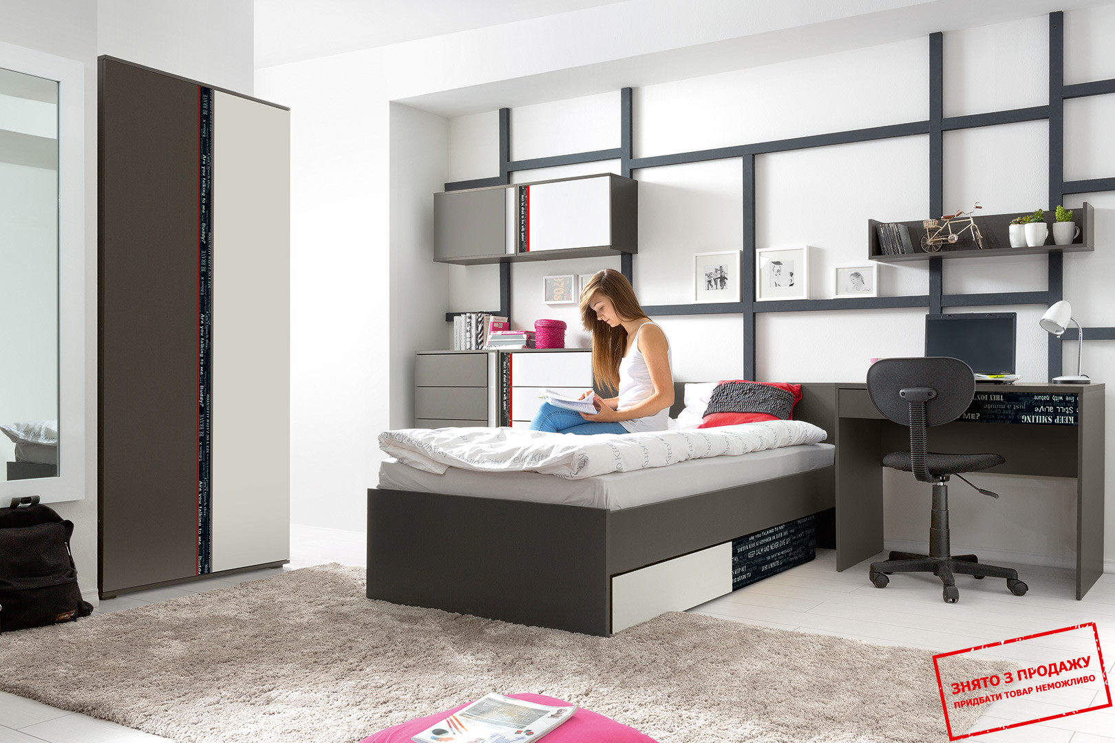 Кілька колірних версій графічних меблів-це більше можливостей для дизайну інтер'єру, які прекрасно підкреслять їх індивідуальність. Ви можете вибрати колір фасадів з декількох модних варіантів: корпус "сірий вольфрам", фасад - "білий / червоний", "дзеркальний глянець", "сірий вольфрам" з двосторонніми "білий / вольфрам сірий" або "жовтий / чорний з білими написами" вставками. Якщо вам подобаються оригінальні рішення, ви також можете вибрати фасади, покриті спеціальною фольгою з написами або червоними акцентами. Зовнішній вигляд відібраних шаф збагачується геніальними двосторонніми плафонами, які можна вільно перевернути.