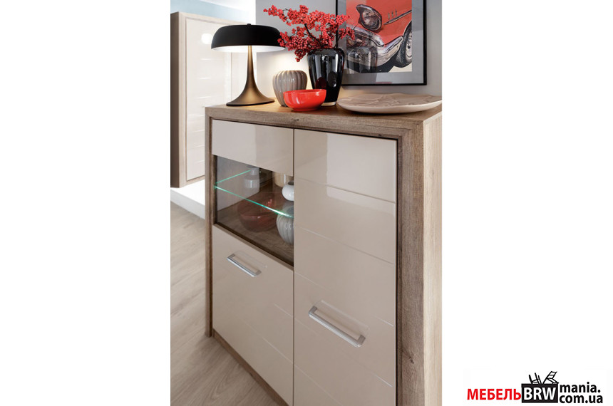 Вітрина BRW KOEN 2 REG1D1W/143 ДУБ КАНЬЙОН МОНУМЕНТ / ПІСОЧНИЙ ГЛЯНЕЦЬ виробництва компанії меблів Блек Ред Вайт складе вірну службу у вашому будинку. Цікавий колірний тандем виробу – дуб каньйон монумент/пісочний глянець – підходить для сучасних інтер'єрів. Характеристика меблів радує нішами для зберігання речей, тумбами, скляною полицею, фірмовими петлями та підсвічуванням. Корпус та фасад меблів виготовлений з різних матеріалів. Зокрема, з ДСП із накладками МДФ та простою плитою МДФ. Ціна виробу повністю відповідає показникам якості. Купити вітрину з колекції KOEN 2 можна з легкістю у нашому інтернет-магазині.