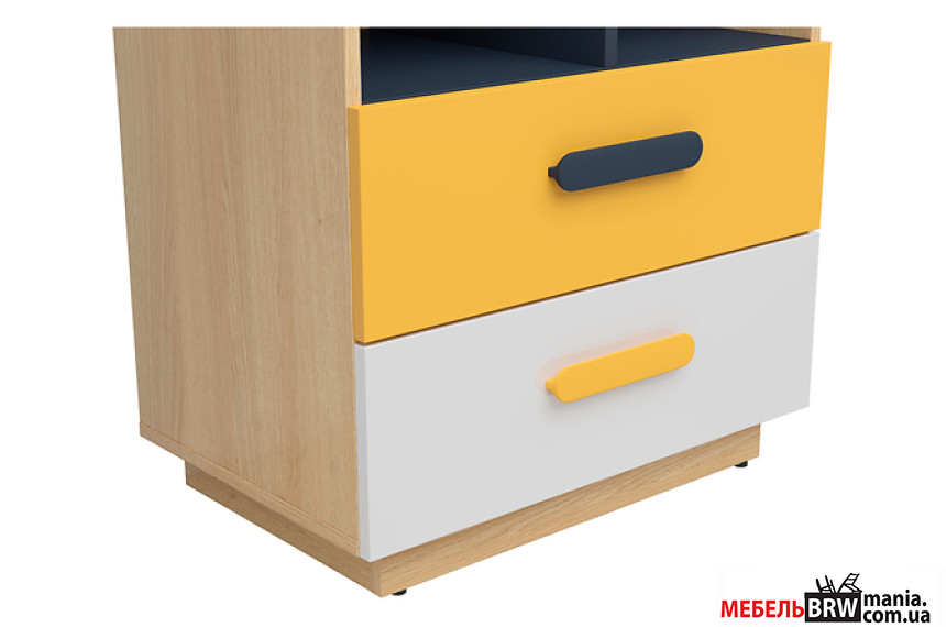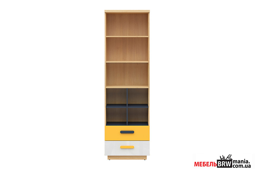 Опис: Стелаж Wesker REG2S BRW відкритий з 2 шухлядами Дуб натуральний/темно-синій/білий глянець/жовтий