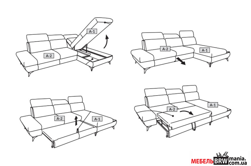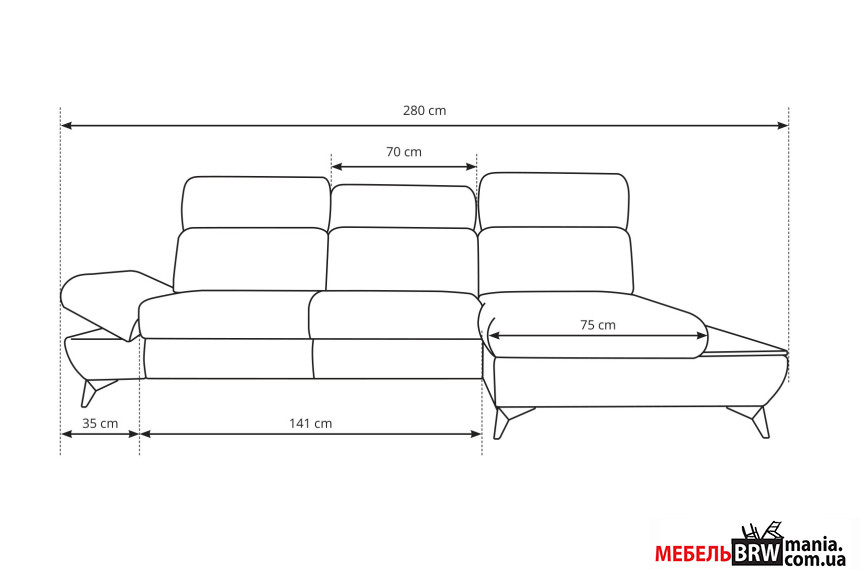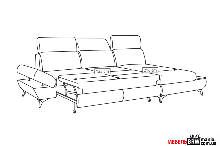 Диван оснащений цікавими, злегка агресивними ніжками з чорного металу, функціональною полицею і рухомими підголівниками і підлокітниками.