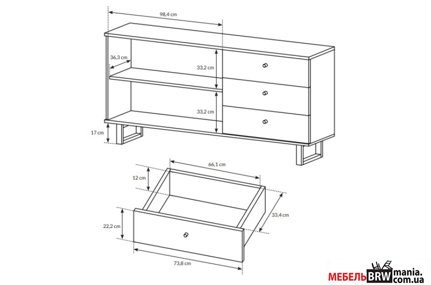 - Максимальне навантаження На полиці 5 кг, На ящики 3 кг, На стільницю 35 кг