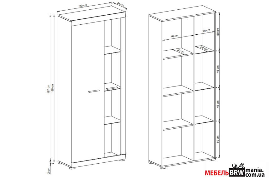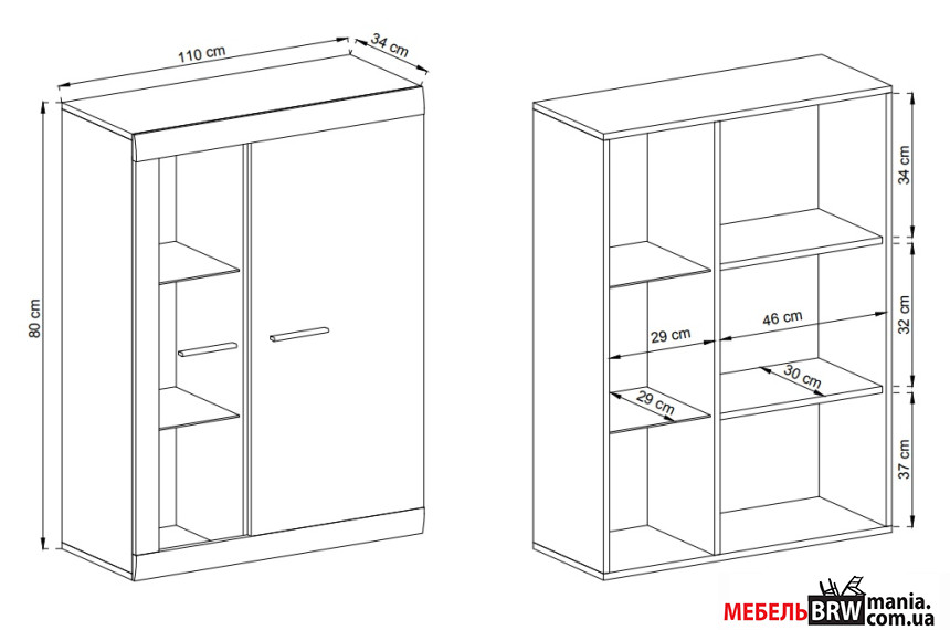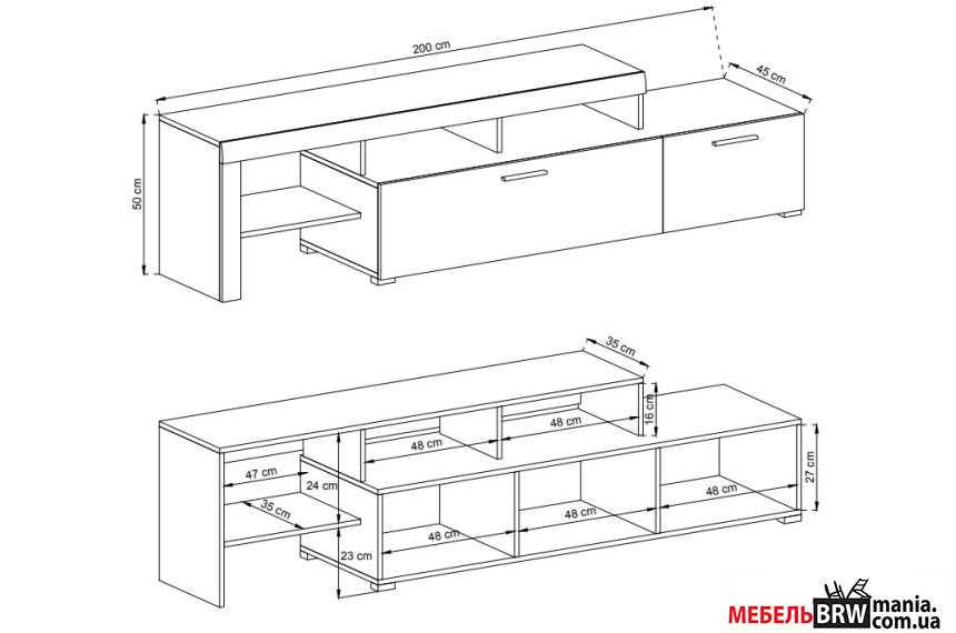 - Розмір модулів Вітрина висока - Д-80 Г-34 В-197; Вітрина навісна - Д-110 Г-34 В-80; Тумба під ТВ - Д-200 Г-45 В-50; Полиця - Д-120 Г-16 В-20