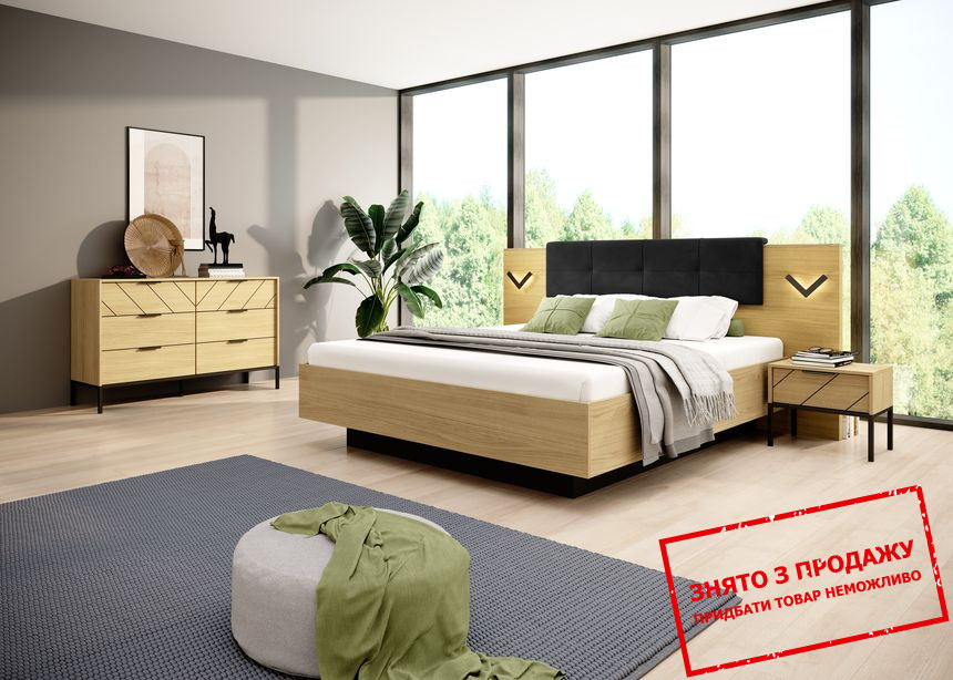 Компонентами системи є комод, двоспальне ліжко, набір для спальні, дві приліжкові тумби, шафа та підсвітка. Кольорова гама у відтінку "дуб сканді" та "чорний" має ідеальний вигляд.