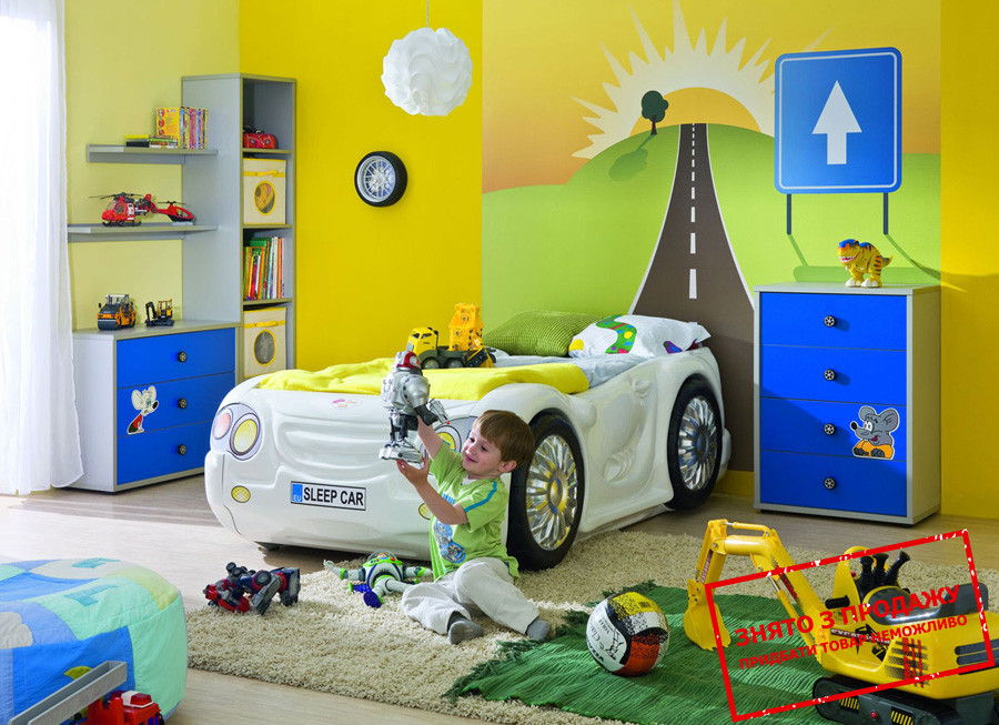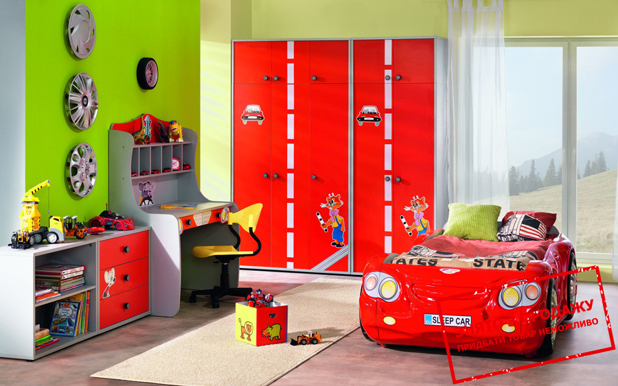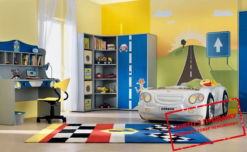 Головним предметом цього гарнітура є стилізоване під автомобіль ліжко. Відпочивати за допомогою такого атрибуту – ще та насолода. Величезною перевагою таких меблів є функціональність, адже дитина можен використовувати ліжко навіть як іграшку.