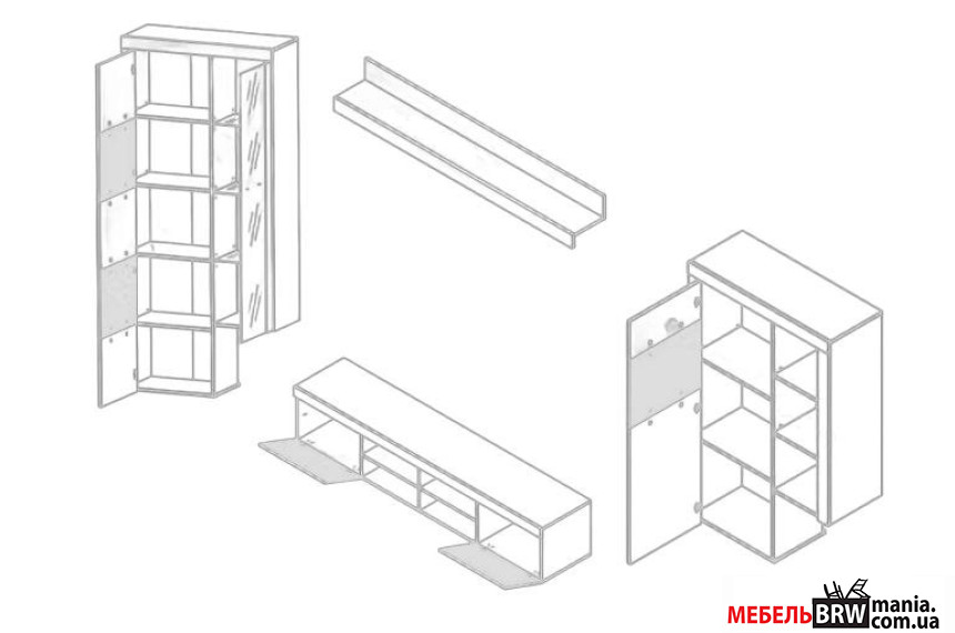 - Тумба ТВ – 1 шт. дві відкидні двері, чотири відчинені ніші;