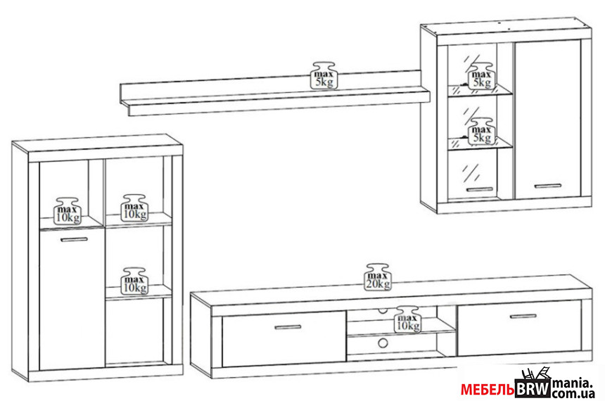 - Розмір модулів Стелаж - Д-80 Г-34 В-120; Вітрина навісна - Д-80 Г-30 В-100; Тумба під ТВ - Д-190 Г-41 В-40; Полиця - Д-150 Г-11 В-20