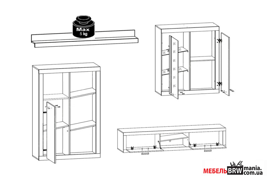 - Тумба ТВ RTV2K – 1 шт. два відкритих відділення, дві відкидні двері; максимальне навантаження на стільницю 20 кг;