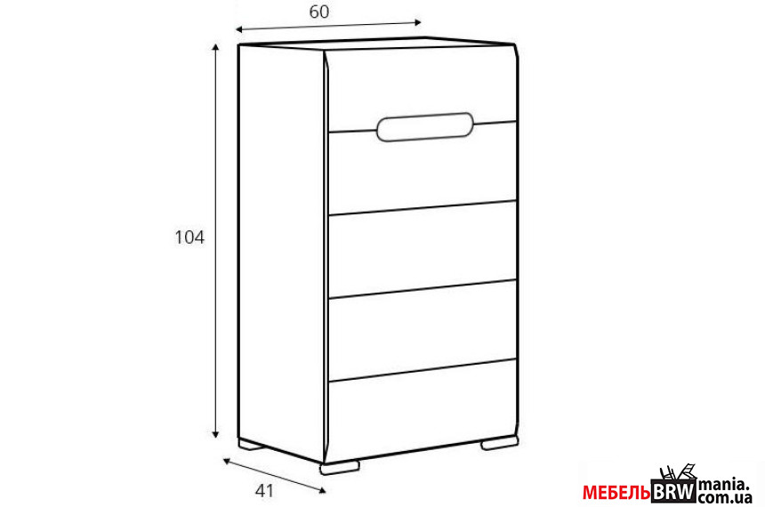 Высокий комод, много ящиков пять штук. Белый цвет с черной полоской сверху. Сочетается с современным стилем в комнате. Полоски выдвигаются быстро и без звука.