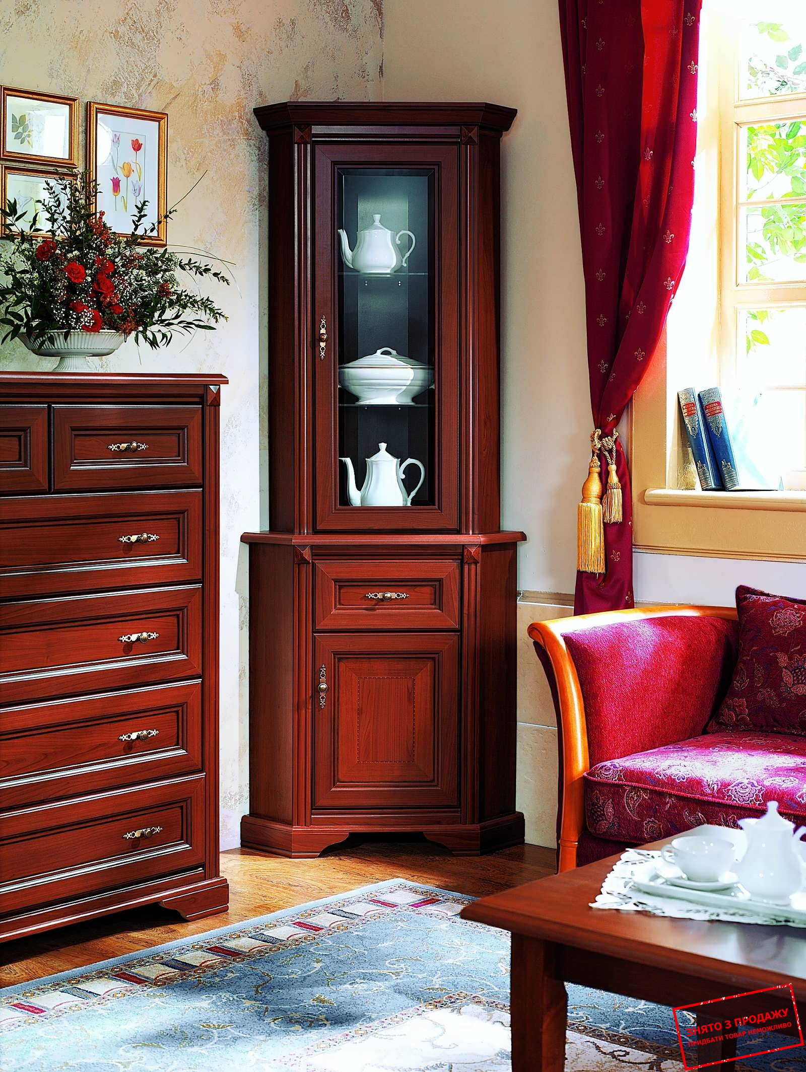 Модульна система представлена відтінком "вишня антична". Такий колір виглядає вишукано, добротно та розкішно. Особливо, у поєднанні з яскравими елементами декору. Також меблі для вітальні "Стиліус" мають: