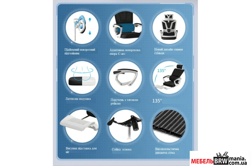 - Регулювання Регульований підголівник, Висота сидіння, 135˚ Кут нахилу, Телескопічна підставка для ніг